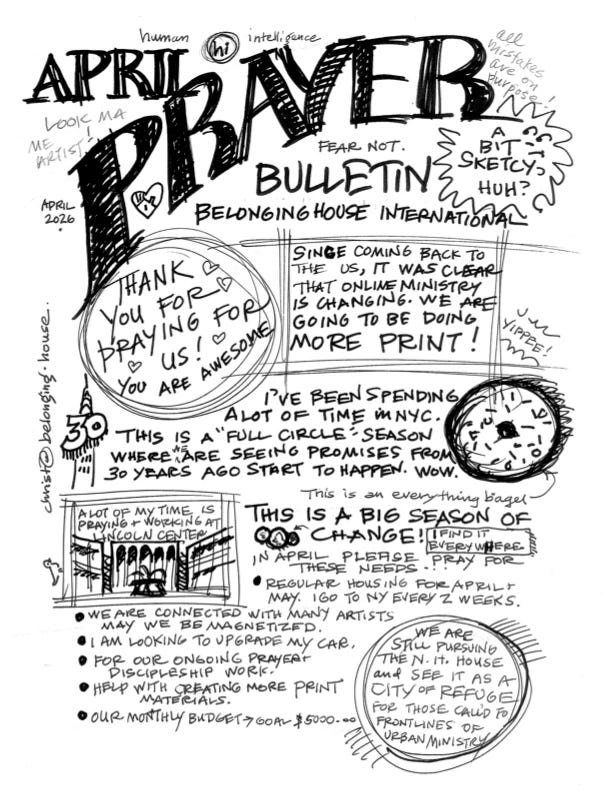 I am sending a physical HAND DRAWN prayer update in the mail to those who commit to praying for Belonging House daily. If you want to receive it, email me directly for more information. Folks have graciously given me stamps to get started!